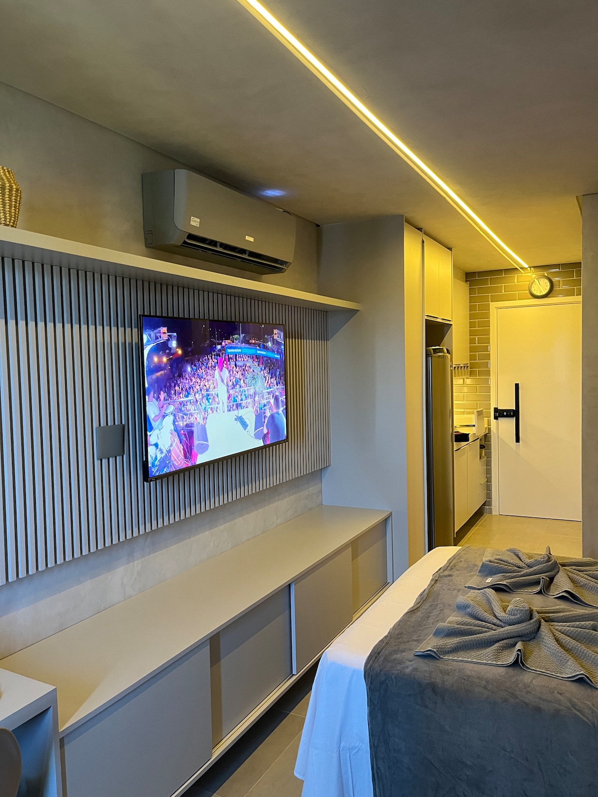 Witamy! Nasz apartament znajduje się w Beach Class Muro Alto Resort, który jest położony nad brzegiem morza i posiada jeden z największych basenów w obu Amerykach o powierzchni 3200 m2, 2 restauracje, SPA, sklep spożywczy, pralnię itp. Apartament posiada 2 pokoje i może wygodnie pomieścić 6 osób, 2 podwójne łóżka oraz 1 rozkładaną sofę (podwójną), wszystkie pokoje wyposażone są w klimatyzację i telewizory 4K z bezpłatnym streamingiem, balkon, kuchnię i stół do posiłków. Plaża Muro Alto jest jedną z najpiękniejszych w Brazylii.