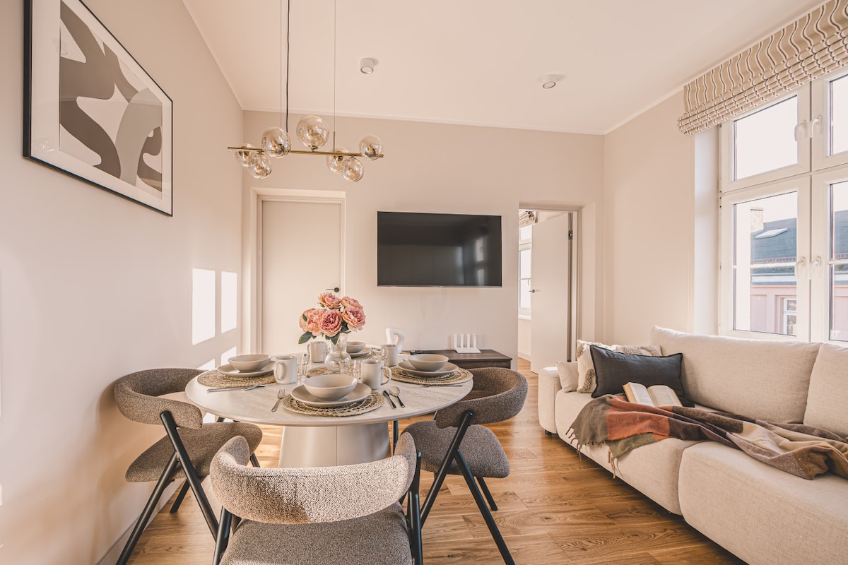 Zapraszamy do wyjątkowego apartamentu na Starym Rynku w Poznaniu. Przestronny salon, urządzony w nowoczesnym stylu z elementami rustykalnymi, zachwyca swoim ciepłem i przytulnością. Duże okna z których można podziwiać ratusz, wpuszczają mnóstwo naturalnego światła, które podkreśla piękno drewnianego sufitu i podłogi. Komfortowa sofa, miękkie poduszki i ciepłe koce zapraszają do relaksu. To idealne miejsce, aby odpocząć po długim dniu i spędzić czas z najbliższymi.