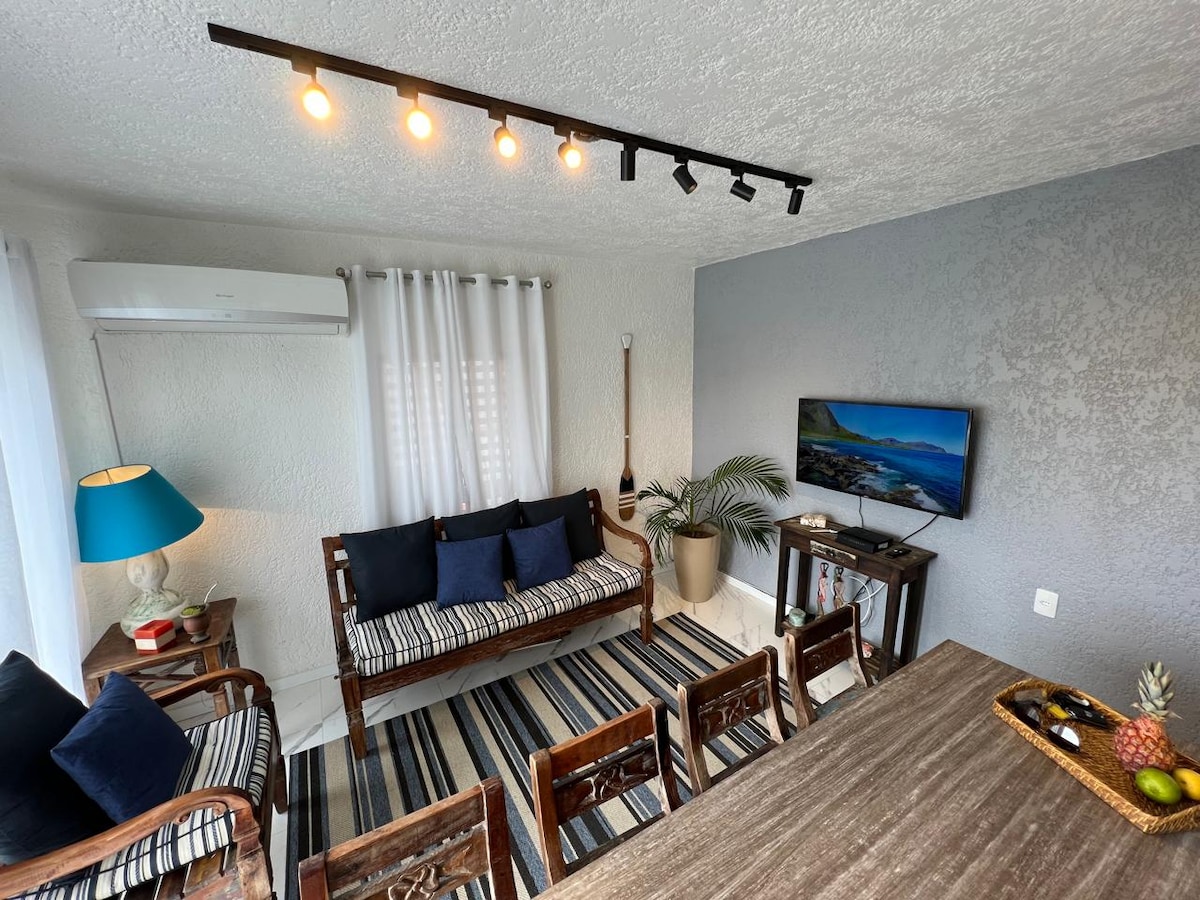 O apartamento possui 2 ar-condicionados. Da janela do quarto, é possível ver o mar. Há cama de casal, e tanto a cama quanto o sofá são novos. O apartamento foi recentemente reformado. A TV disponibiliza Netflix e Globoplay; a TV aberta não está funcionando no momento. A internet é fibra óptica, exclusiva do apartamento, com 200 Mb. O imóvel conta também com churrasqueira e 1 vaga descoberta para carro. O prédio oferece piscina, Wi-Fi nas áreas comuns e serviço de lavanderia.