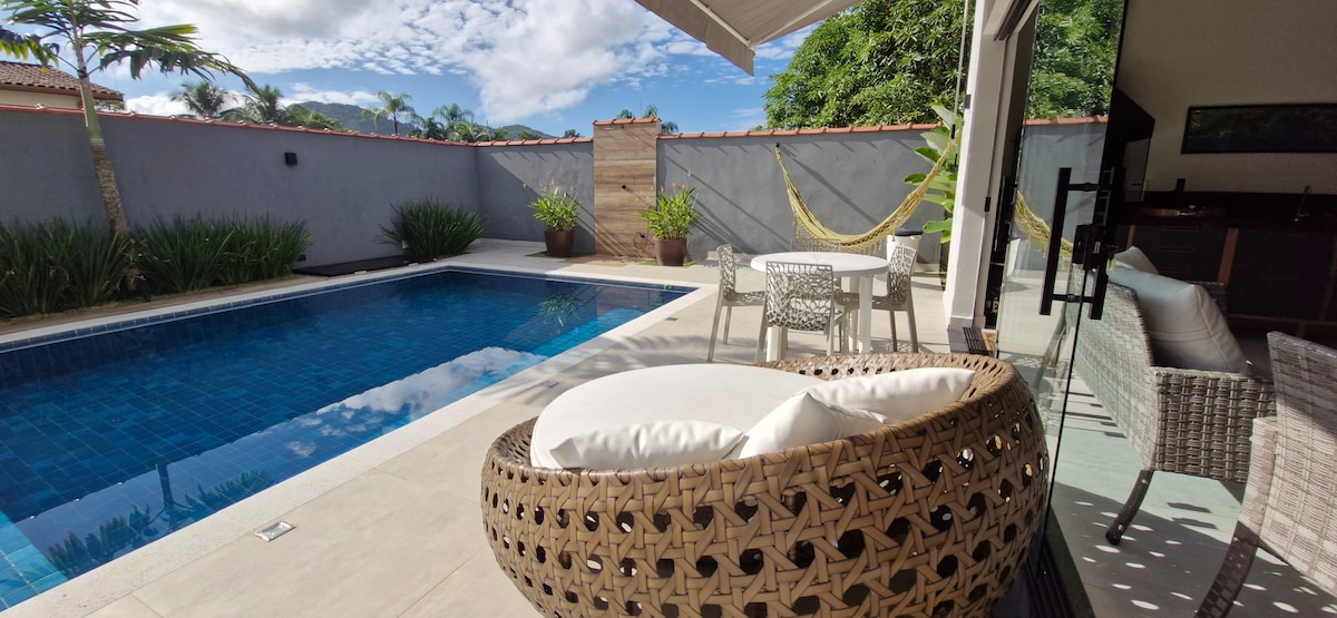 ** Przyjmujemy zwierzęta! Dom z 3 sypialniami (1 z łazienką), klimatyzacją, 3 łazienkami, dużym i pięknym ogrodem, w pełni wyposażoną kuchnią, basenem, Wi-Fi 300 MB światłowodowym, grillem i PIECEM NA DREWNO! Mieści 10 osób. Garaż na 3 samochody. Dom jest radosny, nowoczesny i gustowny. Znajduje się na spokojnej ulicy w dzielnicy mieszkalnej ze strażnikiem, z możliwością wejścia przez bramę do kondominium Samola. Dom znajduje się na pięknej plaży Lagoinha w Ubatuba, zaledwie 8 minut spacerem od plaży (500 m).
