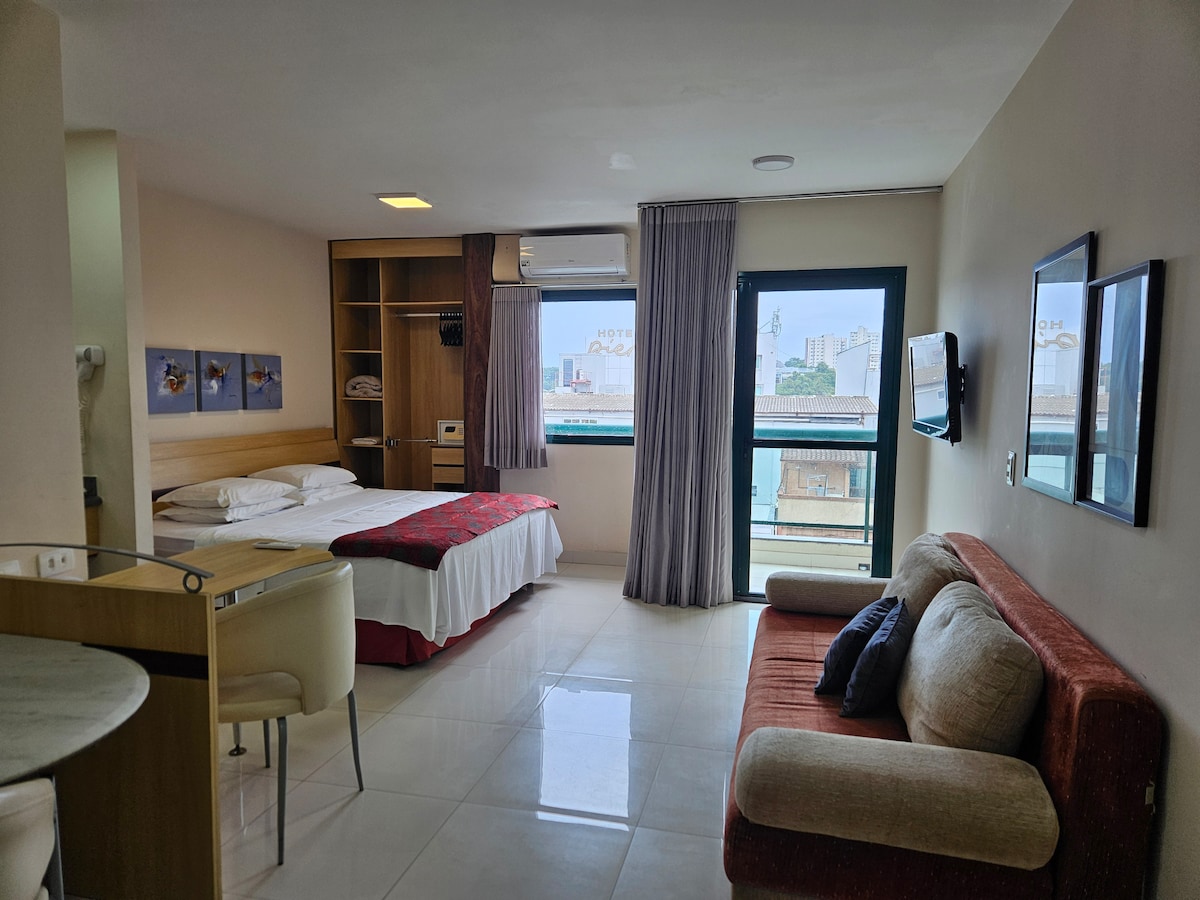 Przestrzeń 13,19 m² ze wszystkim, czego potrzebujesz podczas pobytu służbowego lub wypoczynku. W pokoju znajduje się kuchenka mikrofalowa i minibar dla Twojej wygody. Apartament położony jest w odległości dwóch przecznic od Triângulo das Bermudas – najlepszego kompleksu barów w Vitória, w najbardziej uprzywilejowanej lokalizacji Praia do Canto. W okolicy znajdują się bary, piekarnie, supermarkety, apteki i restauracje. Łatwy dostęp do centrum handlowego Shopping Vitória (5 minut samochodem), 3. most - łączący Vitória z Vila Velha - i plaży Camburi.