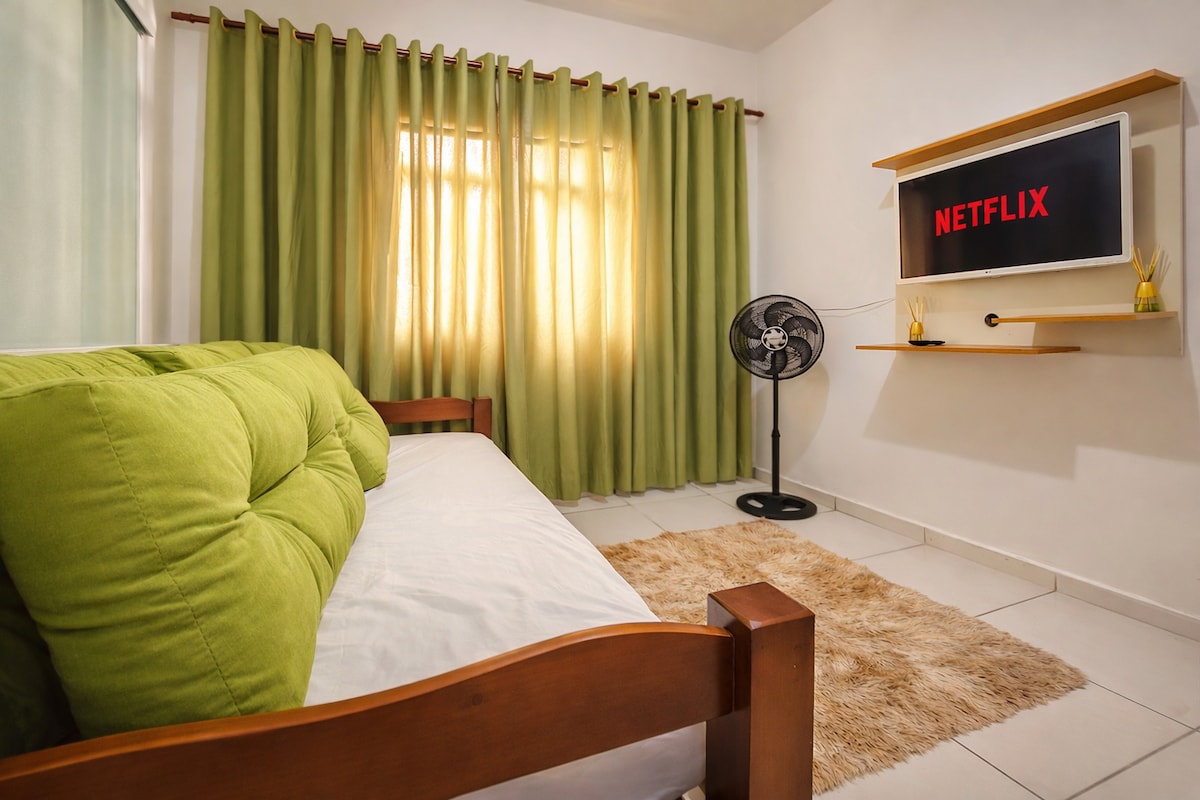 Dom wakacyjny składa się z 1 sypialni/salonu z rozkładaną sofą i dodatkowym łóżkiem; 1 sypialni z podwójnym łóżkiem i szafami, pełnej i wyposażonej kuchni, 1 łazienki do wyłącznego użytku, wentylatorów i balkonu ze stołem i hamakiem, a także wspólnego dostępu do zbiornika, sznurów do suszenia, węża i przyborów do czyszczenia. Możesz poprosić o żelazko i deskę do prasowania za darmo. Dostępny jest telewizor Smart TV z bezpłatnym dostępem do Netflix, Max i globoplay. Oferuje wspólny parking wewnętrzny i bezpłatne WiFi.
