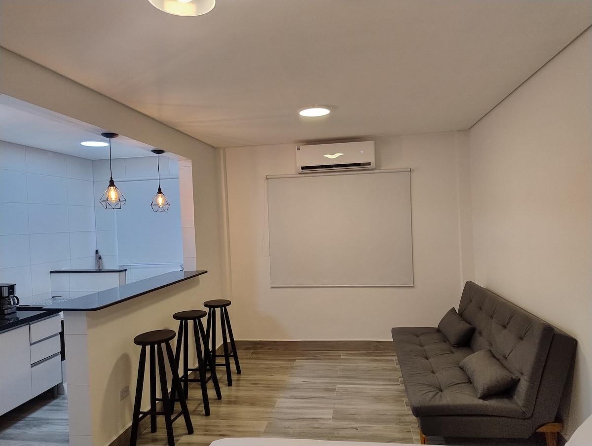 Apto pé na areia com vaga de garagem próximo a restaurante, barzinhos, farmácia, supermercados, etc. PRAIA GRANDE - SP Apto novo todo mobiliado, super aconchegante, excelente localização, 1 dormitório e 1 wc. Tomadas 110v. Lugar limpo, organizado e pertinho da praia. Tem utensílios domésticos, microondas,cafeteira,fogão, forno, geladeira, Aifryer roupas de cama, e banho . Tv smart, ar condicionado e Wi-Fi. Estacionamento 24h,vaga de garagem no shopping não paga nada incluso no apartamento.