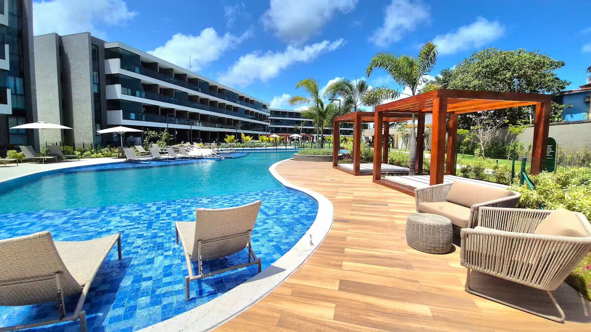 Ciesz się niezapomnianymi wakacjami w Porto de Galinhas w ULUBIONYM MIESZKANIU GOŚCI, które znajduje się w 1% NAJLEPIEJ OCENIANYCH! Apartamento 3 QTS Alto Padrão Luxo w Condomínio Resort Beira Mar, z fantastyczną strukturą rekreacyjną i parkiem wodnym z ponad 20 basenami. 3 km od centrum Porto i 1 km od naturalnych basenów Cupe. – Klimatyzacja w SALONIE i SYPIALNIACH - Wyposażona kuchnia – Wi-Fi 200 m -działanie – Enxoval Completo (łóżko i kąpiel) Café da Manhã, Transfer i wycieczki (opcjonalnie) - Łóżeczko dziecięce