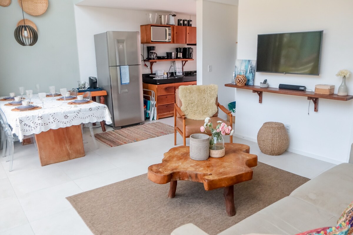 Close to Patacho Beach, our space is designed to offer everything we value in our own travels. With two full suites for up to six adults, a private balcony with barbecue, A/C in every room, a fully equipped kitchen, and a washer-dryer! We guarantee a unique stay! In addition, you’ll have access to a full resort-style condominium with a gym, pool, jacuzzi, playground, and 24-hour reception. The location is excellent, close to restaurants and the natural beauty of Milagres and Japaratinga!