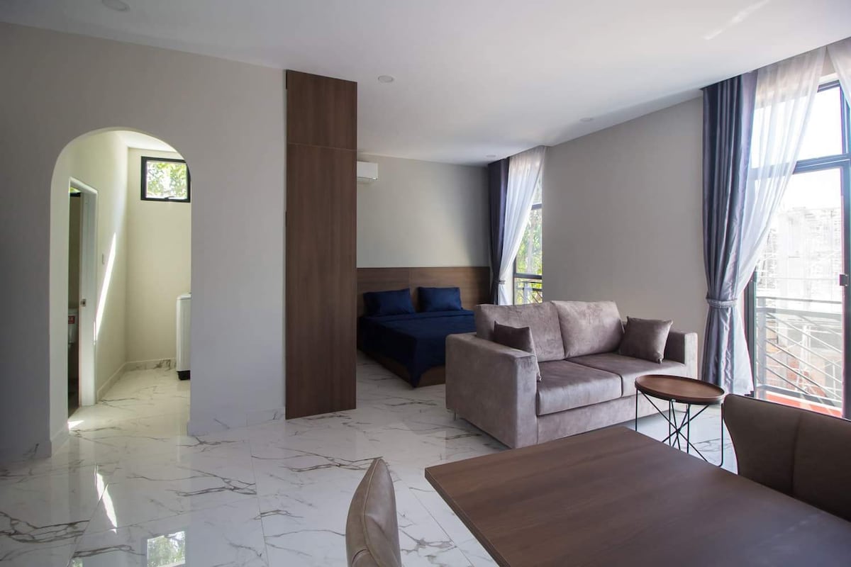 ** CHECK OUT OUR OTHER DIGITAL NOMAD-READY LISTINGS IN THE SAME RESIDENCE !! ** We're all about mindful travel. Our guests mean the world to us, and we're passionate about looking out for our local team, and community. Our roomy studio is part of a charming property with seven separate units, right in the heart of Kandal Village. The best part? It's just a five-minute walk to downtown. Inside, you'll find handcrafted local furniture, tons of natural light pouring in through big glass doors.