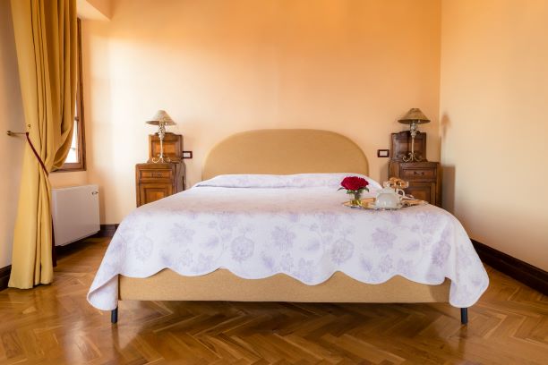 Komfortowy apartament typu studio na poddaszu (35 m²) z prywatnym balkonem i widokiem na średniowieczny zamek. Składa się z salonu z parkietem i w pełni wyposażonej kuchni, wyposażonej w klimatyzację, minibar, telewizor 4K z anteną satelitarną, sejf, Wi-Fi i zestaw do herbaty. Elegancka marmurowa łazienka z prysznicem, suszarką do włosów i zestawem kosmetyków. Dedykowany najbardziej wymagającym klientom, którzy chcą zapewnić sobie maksymalny komfort podczas pobytu w Soave. Dopłata za śniadanie na życzenie 10,00 euro za osobę. Opłata klimatyczna: 2,00 euro za osobę.