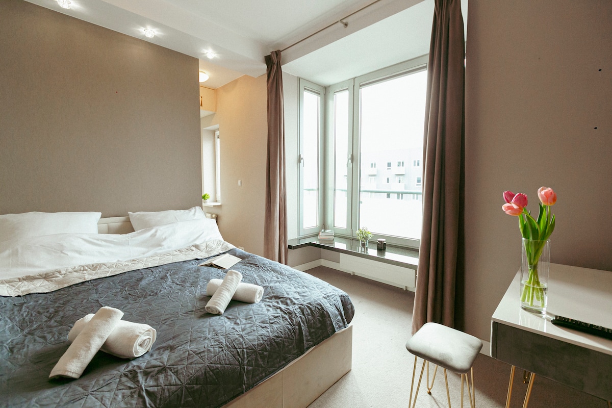 Zapraszamy Cię do zamieszkania w naszym nowym apartamencie, który przygotowaliśmy z myślą o Twoim komfortowym pobycie. Mieszkanie usytuowane w nowym osiedlu na granicy centrum, urządzone i wyposażone jest tak, aby goście mogli czuć się tu wygodnie zarówno podczas urlopu jak i pobytów służbowych. Dogodna lokalizacja pozwala bardzo szybko dotrzeć do głównych miejsc w Warszawie, a także łatwo dostać się w 10 min do lotniska oraz stołecznych dworców kolejowych.