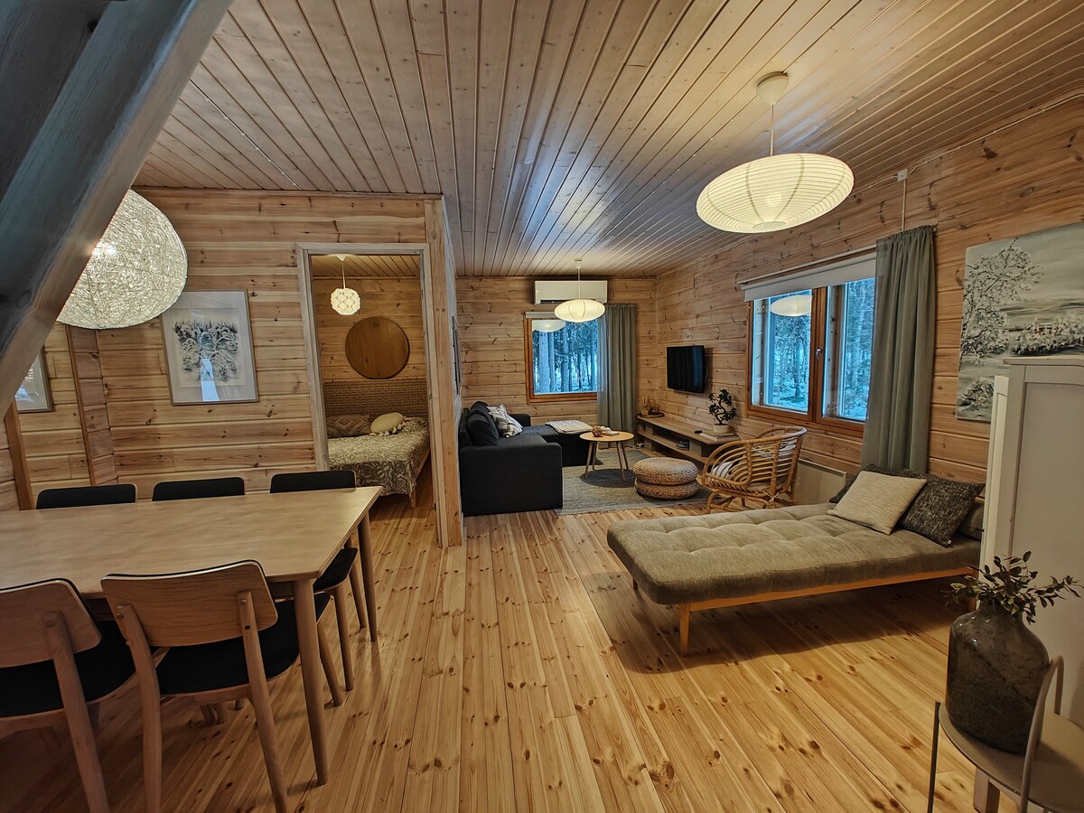 Umeblowany apartament z jedną sypialnią. Jezioro 400m . Nie ma własnej plaży. Wędkarstwo, jazda na sankach. Polowanie. Spokój przyrody. Możliwość jacuzzi. Własne wejście. Dostępna sauna z prywatnym wejściem. Dostępna jest również pralka i suszarka. Dostępna jest również sauna na świeżym powietrzu. Odległość od miasta ok. 35 km. Bardzo dobre możliwości jazdy na skuterach śnieżnych i wędkowania podlodowego. Polowanie na terenie państwowym (dozwolone). Dostępny Netflix. Woda z kranu jest dobra i nadaje się do picia. Wi-Fi.