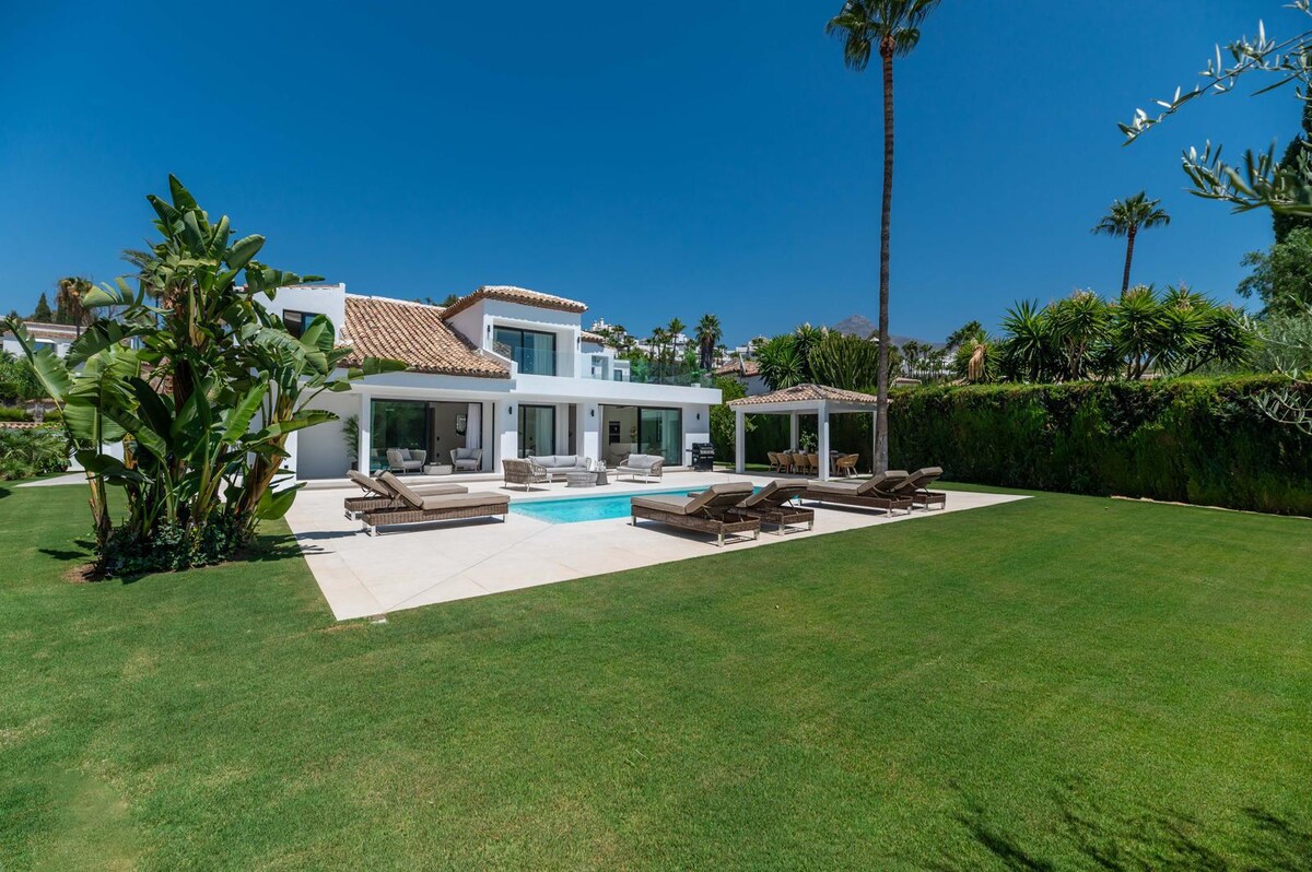 We highly recommend this Villa with heated pool for families, golf players, couples, business trips or just simply a relaxing stay. Parties & loud music are forbidden in this family friendly area. Villa with a big garden in the center of Nueva Andalucía. Well kept gated community, private heated pool, free garage space. Close to restaurants and supermarket. Close to 3 top golf courses, gym & beach. For those looking for a luxury Villa in a Prime location and secure area this is the one.