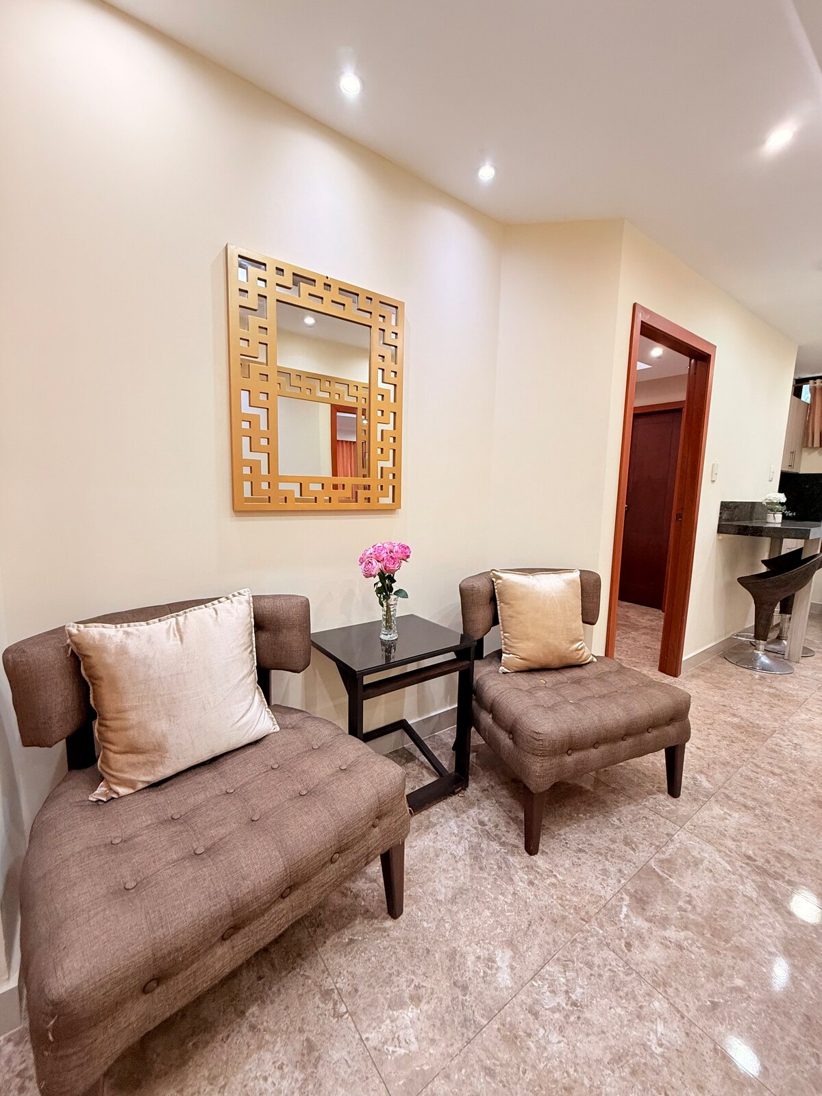 Przytulny i dobrze wyposażony apartament w ekskluzywnej i bezpiecznej okolicy. Ciesz się wygodną przestrzenią z telewizorem, klimatyzacją, wyposażoną kuchnią i prywatną łazienką z ciepłą wodą. Pokój ma kwadratowe i pół łóżka oraz idealną atmosferę na odpoczynek. Ponadto będziesz mieć dostęp do pralki, suszarki i pięknego basenu, aby zrelaksować się podczas pobytu.