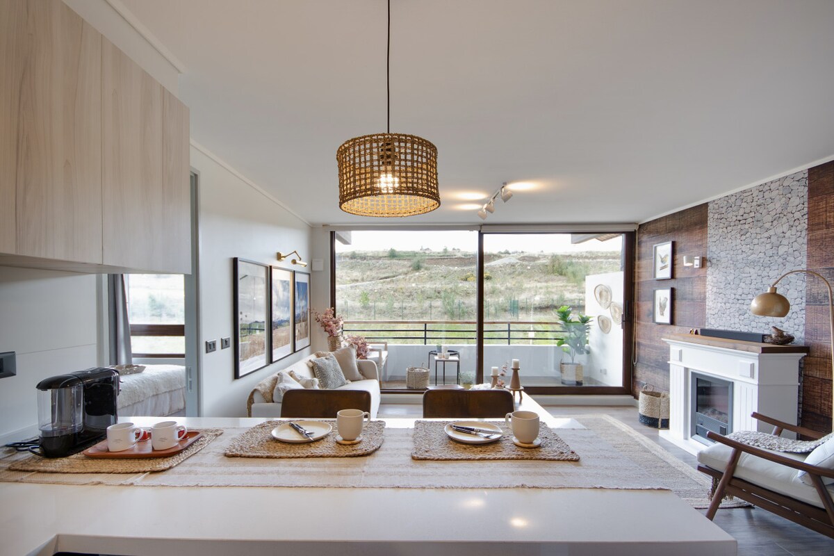 Terraza privada rodeada de naturaleza, chimenea y un exclusivo wellness studio para desconectar de verdad. Un espacio de diseño minimalista inspirado en aves chilenas, pensado para descanso profundo y experiencias conscientes. A solo 9 minutos del Lago Llanquihue, es ideal para grupos de amigos y parejas con hijos pequeños que buscan reconectar con la naturaleza.