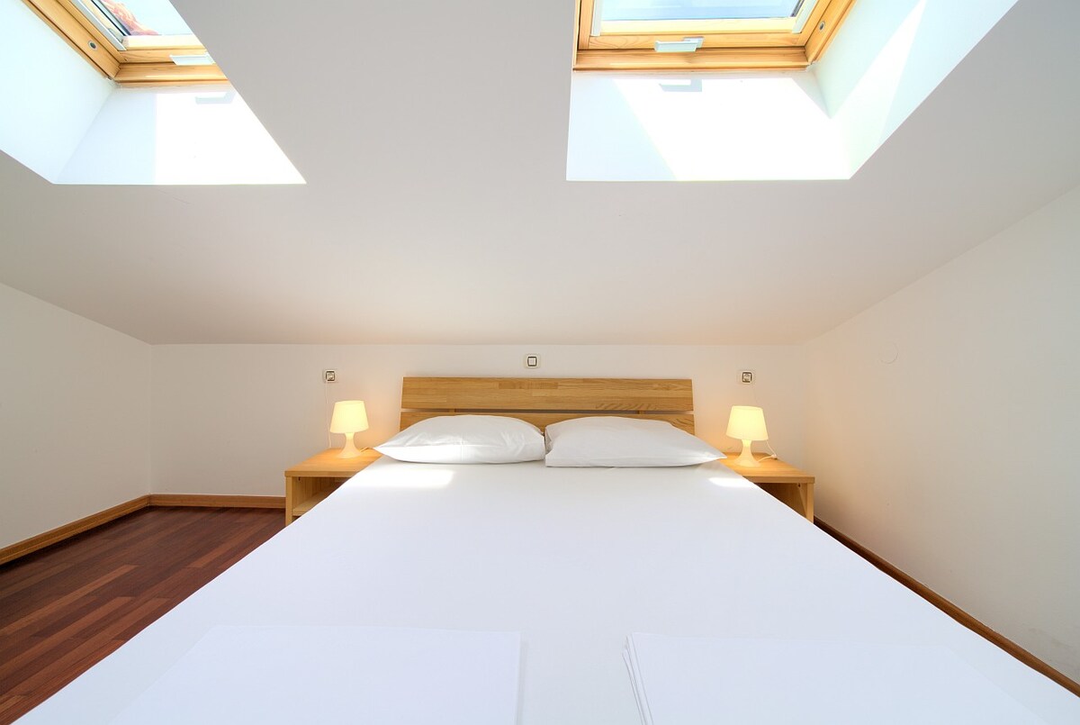 Ten nowoczesny i pięknie urządzony apartament znajduje się na drugim piętrze domu rodzinnego. Apartament o powierzchni 50 m2 może pomieścić od 4 do 5 osób i składa się z kuchni i salonu, dwóch sypialni z łóżkami małżeńskimi, łazienki z prysznicem oraz balkonu. Dodatkowe udogodnienia w tym apartamencie obejmują klimatyzację, Wi-Fi, telewizję satelitarną, wspólny grill i miejsce parkingowe na podwórku. Zwierzęta nie są akceptowane.