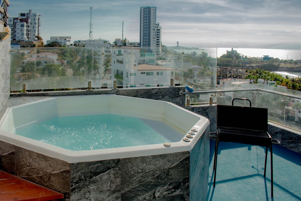 Luksusowy apartament na 3 piętrze z widokiem na ocean w Punta Centinela, idealny dla wszystkich grup wiekowych. Ciesz się niezapomnianymi doświadczeniami z najwyższej klasy udogodnieniami: całodobową ochroną, siłownią, siłownią, miejscem na grilla, basenami, basenami, basenami, jacuzzi parkingiem, windą, klimatyzacją, ciepłą wodą, Wi-Fi, DirecTV, dużym łóżkiem, rozkładaną sofą, kuchnią wyposażoną w podstawowe przybory. Wyjątkowy akcent, wyłączny dostęp do Klubu i Private Beach of Punta Centinela. Zarezerwuj teraz i poznaj Paradise Experience nad morzem!