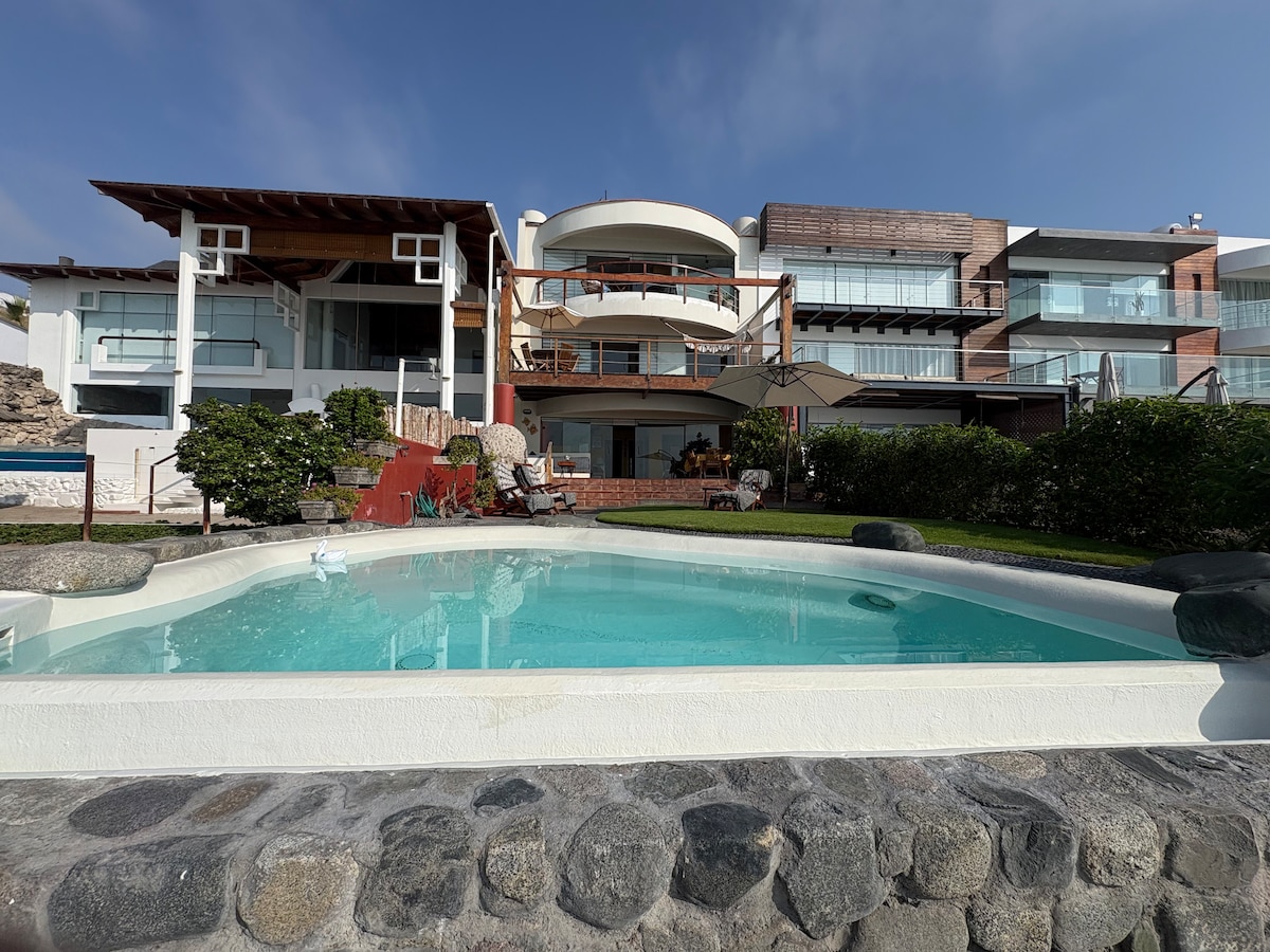 You will feel in a cruise just for you! All areas are for exclusive guest use (no sharing with others) 3 rooms, kitchen, dining room, leaving, terrace, wifi, cable, garden, pool, parking for 2 cars 40 meters to the beach Best spot for surfing Caballeros, Señoritas (direct view) or just chill and relax with the sea view Families and group of friends are welcome. The house have plenty of space for you to have fun, listen your music and enjoy one of the best views in Lima with total privacy