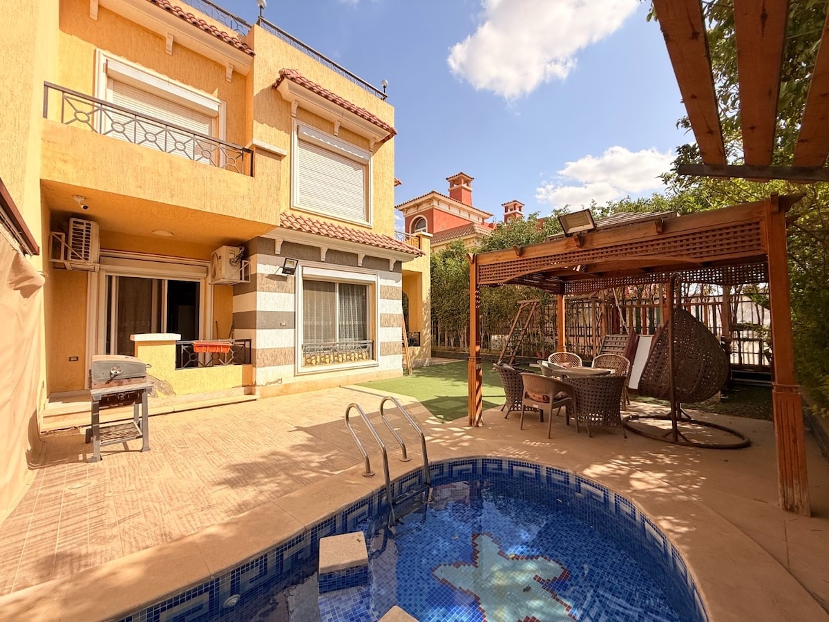 W willi znajduje się klimatyzacja i balkon. Ta willa oferuje prywatny basen, ogród, grill, bezpłatne Wi-Fi i bezpłatny prywatny parking. W willi znajdują się (6) sypialnie, salon, telewizor satelitarny z płaskim ekranem, wyposażona kuchnia oraz (7) łazienki z bidetem i prysznicem, a także taras i widok na miasto. W willi dostępne są ręczniki i pościel. Goście mogą korzystać z krytego basenu. Zakwaterowanie w willi znajduje się 23 km od piramid w Gizie. Port lotniczy Sfinks znajduje się 25 km od nieruchomości.