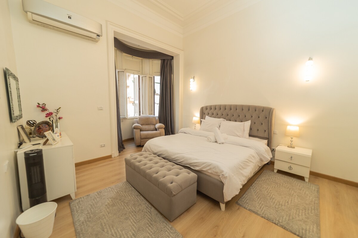 The apartment is situated in a heritage building in beautiful Garden City; a historic area in the heart of Cairo dating back to early 20th century. The area is known for its green, quiet, upscale and secure atmosphere and is a major destination for tourists looking to experience the real charm of the bustling city, with the option of easily retreating (by foot) to this quiet[er] zone. The 4 meter high ceiling historic apartment has been renovated in a minimalist style.