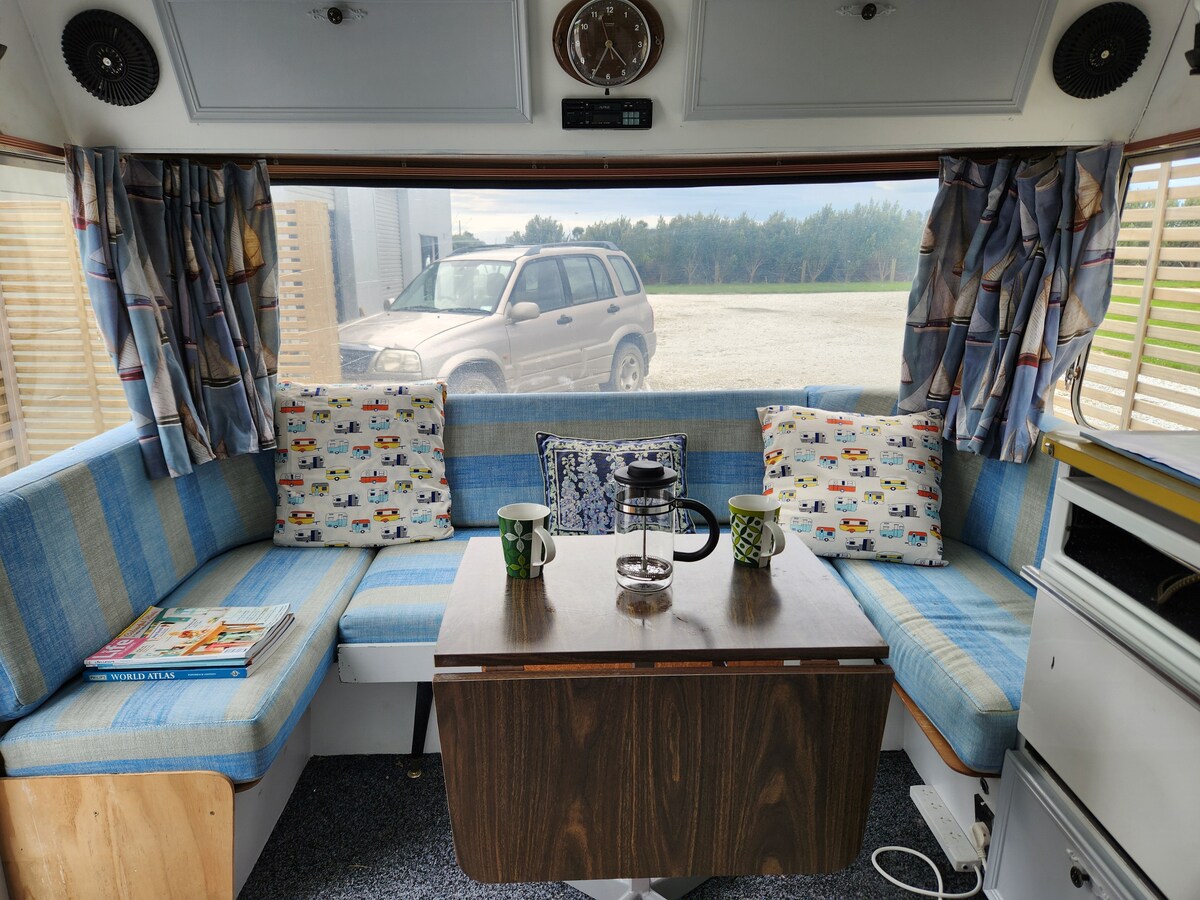Catlins Fortrose – przyczepa kempingowa, widoki na morze i zachód słońca