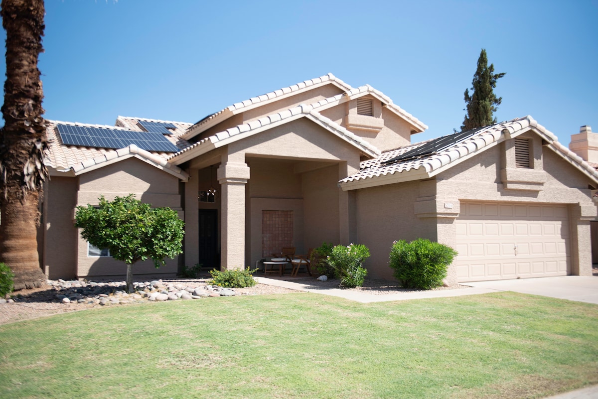 Desert Oasis w/ Private Pool (not heated), BBQ area, full kitchen, King Bed w/ Tempurpedic Mattress in Master w/ walk-in shower, large tub and handicap handles in each bathroom for your convenience. Walking distance to PARK, 4 miles to GOLF COURSE, less than 5 miles to SCHNEPF FARMS w/ PETTING ZOO, 3 Miles to FOOD and SHOPPING, 12 miles to LEGACY SPORTS COMPLEX, 29 miles to SALT RIVER TUBING. 4 Bedrooms, 3 Full Baths, Pack n Play, WiFi, Cable TV, AC, colorful areas for great selfies.