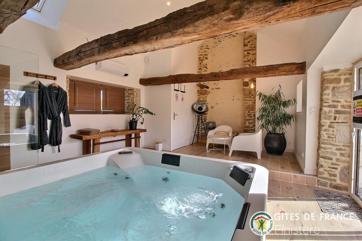 Notre gîte est entièrement rénové pour vous y accueillir avec un accès espace bien-être compris avec un jacuzzi pour 4 personnes. L'espace bien être vous est accessible et privatif, excepté le matin de votre départ, et ce afin de procéder à la vidange et nettoyage du spa. Chemins de grande randonnée, VTT, vallée verte. Wake West Park à 10mn, Village de Poul Fetan à 10 mn. Lorient et plages à 35 mn. Draps, serviettes et peignoirs de bain fournis.