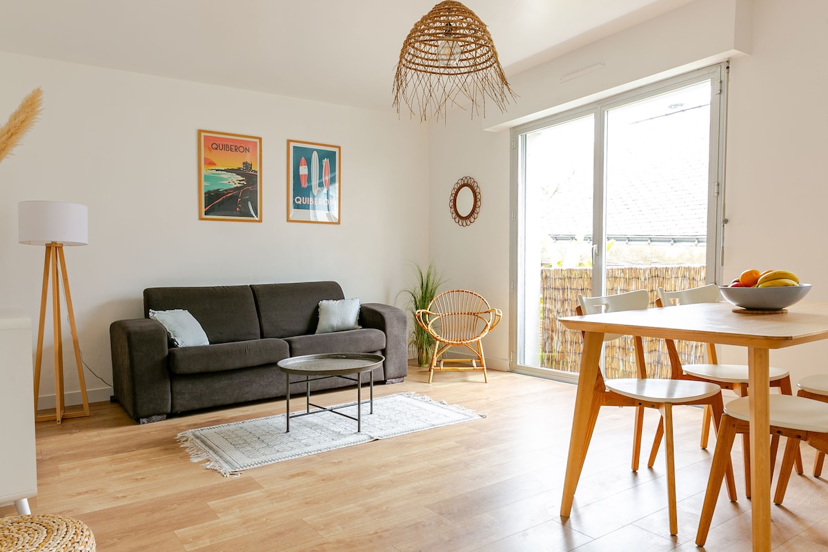 En plein centre de Quiberon, tout à pied. Appartement douillet 50m2 au calme, offrant une superbe terrasse plein sud face à la grande plage. Grand séjour cuisine, chambre lit king size, salle d'eau, WC séparé. Cuisine équipée lave vaisselle, four, micro-ondes, lave-linge, nespresso, Airfryer, appareil raclette. Terrasse équipée table extérieure et transats. Banne électrique. Parking privé (accès étroit cf photo). TV, radio HIFI, internet. Linge compris si séjour de 7 nuitées minimum.