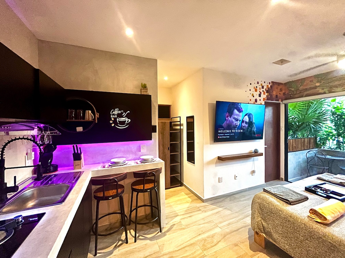 Luksusowy apartament w Aldea Zama. 7 minut jazdy samochodem od plaży, 5 minut jazdy do Tulum Centro, w odległości spaceru od restauracji i sklepów w Aldea Zama. Lokalne i wysokiej klasy meble tworzą czyste i artystyczne środowisko. Prywatny basen i parking podziemny. Dwa darmowe rowery. Własne kino opuszcza się z sufitu za pomocą jednego kliknięcia. W pełni wyposażona kuchnia, telewizory, gry. Nie musisz nawet wychodzić z domu.