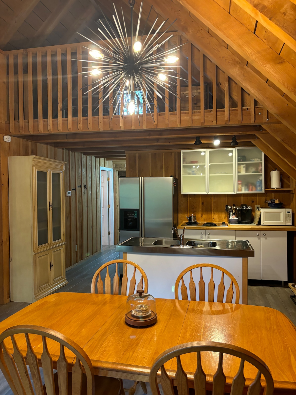 Witamy w Cabin #4, naszej zabawnej chatce myśliwskiej. Nasza chata ma 120 stóp kwadratowych, czyli mniej więcej tyle, co standardowa sypialnia. Ma poddasze z pełnowymiarowym materacem, zwijaną poduszkę, (idealną dla dziecka do spania), kanapę/łóżko futon, aneks kuchenny, wannę z prysznicem i duży taras. Chata jest w pełni umeblowana, ma klimatyzację/ogrzewanie, telewizję satelitarną, Wi-Fi oraz palenisko i drewno. Chata jest otwarta sezonowo od kwietnia do października każdego roku.