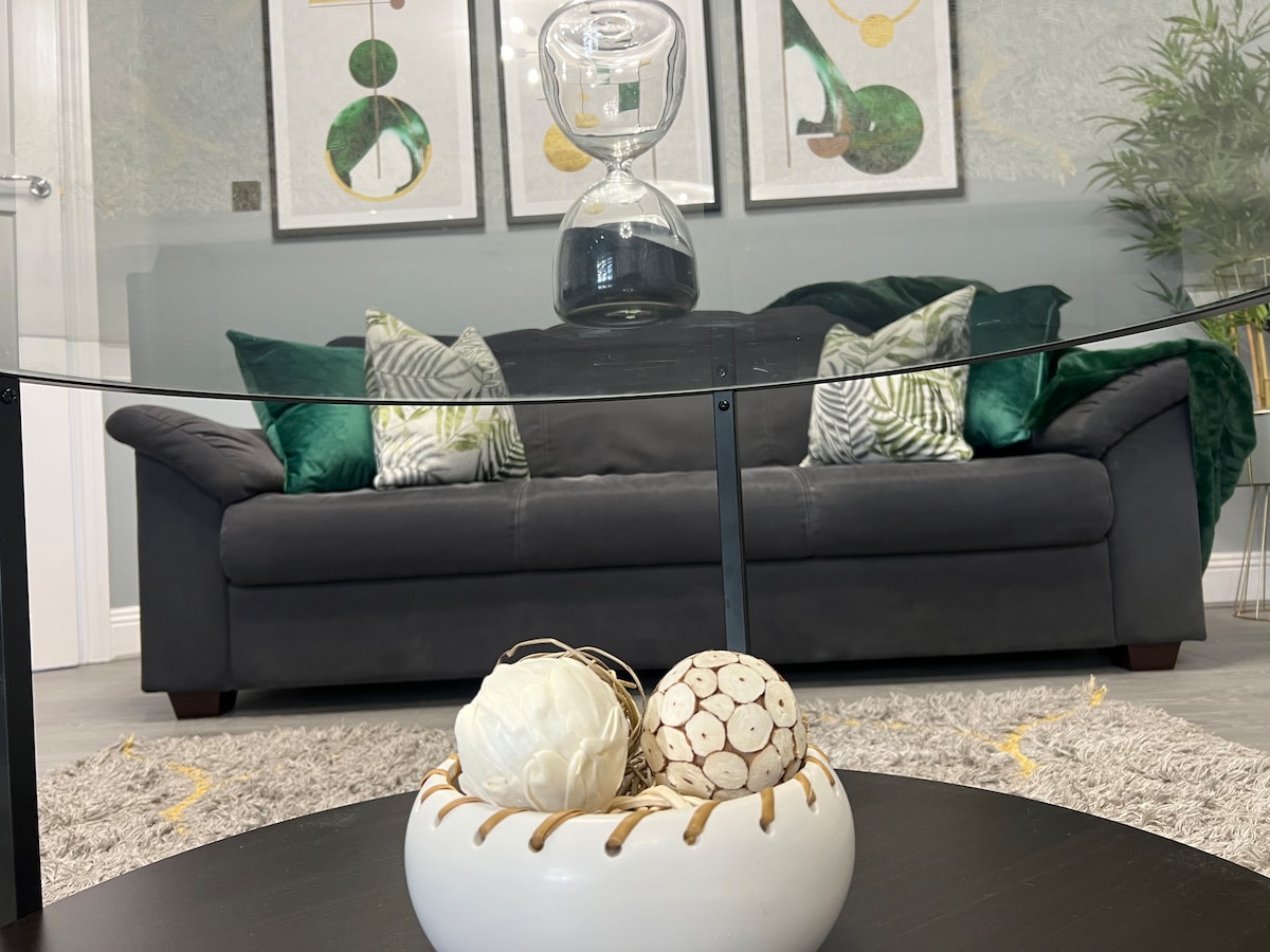 2 Bedrooms furnished with award winning OTTY mattresses for a deep sleep, sliding mirrored wardrobes and ample storage for your belongings. Luxury bathroom with steel bathtub and shower facility. Open plan Living room/ Dining and Kitchen area, Crystal chandelier to light your space to a Snooker/ Pool table, 55" smart TV, Cosy L Sofa, Smoked Glass Coffee and Dining table. Well stocked kitchen with appliances including a washing machine and dishwasher.