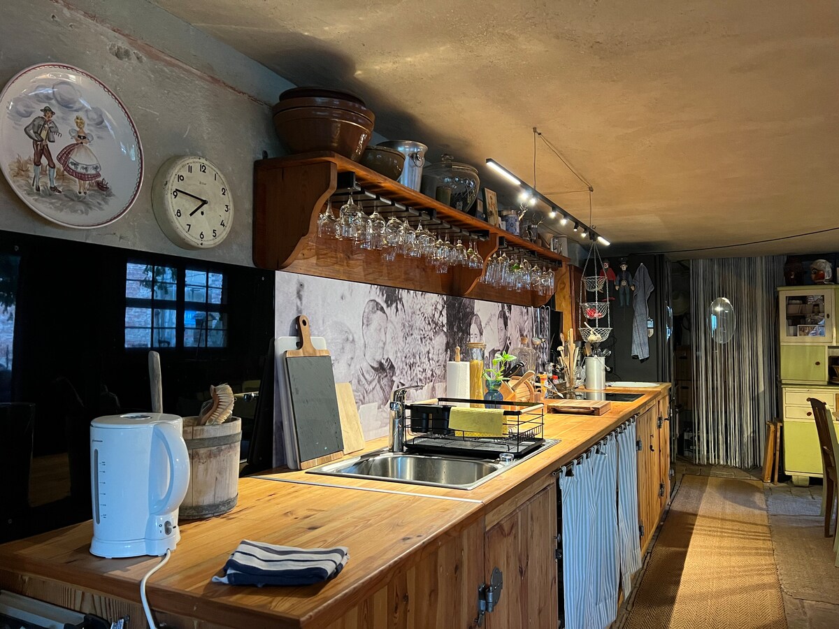 Dom wiejski na dwóch poziomach o powierzchni 65 m²! W pełni wyposażona kuchnia, łazienka – toaleta, kabina prysznicowa, pralka, wieszak na ubrania; część dzienna i sypialna na otwartym poddaszu, taras z grillem, ogród do użytku po wcześniejszym uzgodnieniu, miejsce parkingowe na pojazd, przechowalnia na rowery. Możliwość dostawki za 20 EUR za noc za osobę od 5 lat. W razie potrzeby można poprosić o wskazówki dotyczące wycieczek, dostępny jest folder informacyjny - w przeciwnym razie będę dostępny na motto „Wszystko jest możliwe, nic nie trzeba robić!”