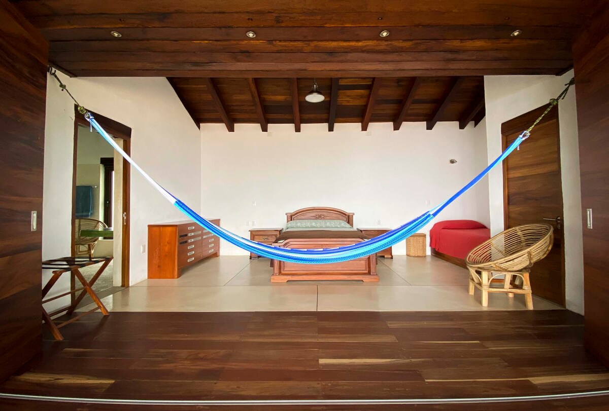 breezy safe bungalow on a hill surrounded by forest, has an ocean and punta cometa view, only 10 min walk from beach, shops, restaurants. It has hardwood floor, palm leaf roof, super comfy hammock on the balcony, many windows with Moskito nets and it's completely safe, all property is gated. You need to walk stairs to get in, this also keeps traffic noise away, we help with luggage with our ATV if necessary. We offer you endless drinking water, cooking basics, coffe and starlink internet.