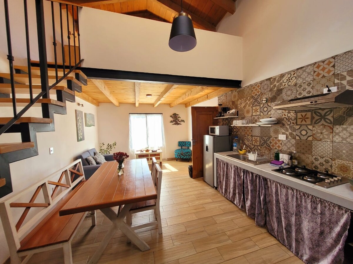 Komfortowy i w pełni wyposażony dom na wypoczynek w górach, z panoramicznym widokiem i bardzo blisko centrum San Cristóbal. Posiada 2 sypialnie, 2 kompletne łazienki, internet, telewizor Smart TV, salon, jadalnię, wyposażoną kuchnię oraz pralkę i suszarkę. Jesteśmy 10 minut jazdy od zabytkowej dzielnicy Guadalupe i 15 minut od centrum San Cristóbal.
