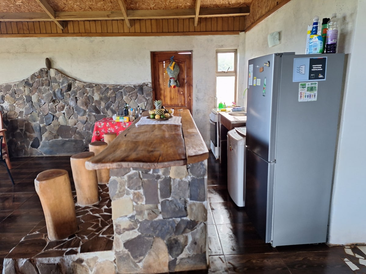 Ciesz się prostym urokiem tego przytulnego miejsca z rustykalnym akcentem pośród przyrody, z widokiem na wulkan Rano Kau, w pobliżu plaż, kompleksu archeologicznego Tahai, gdzie można podziwiać najlepsze zachody słońca na wyspie, ogrodu botanicznego, muzeum i innych atrakcji.