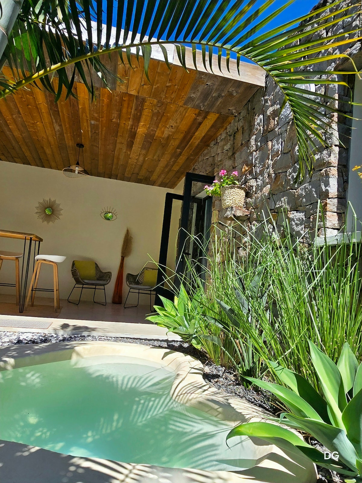 Mamzelle Sega to uroczy 4-gwiazdkowy domek o powierzchni 67 m², z dwiema sypialniami z łóżkami typu king-size, dwoma prysznicami na zewnątrz, łazienką z wanną i w pełni wyposażoną kuchnią. W tropikalnym ogrodzie znajdują się leżaki, łóżka, altana w stylu balijskim, grill i od czerwca prywatny podgrzewany basen z bąbelkami. Położony na południu wyspy, 5 minut od plaży i sklepów, jest idealny do odkrywania dzikiego Południa. Spokojne miejsce, idealne na relaks.