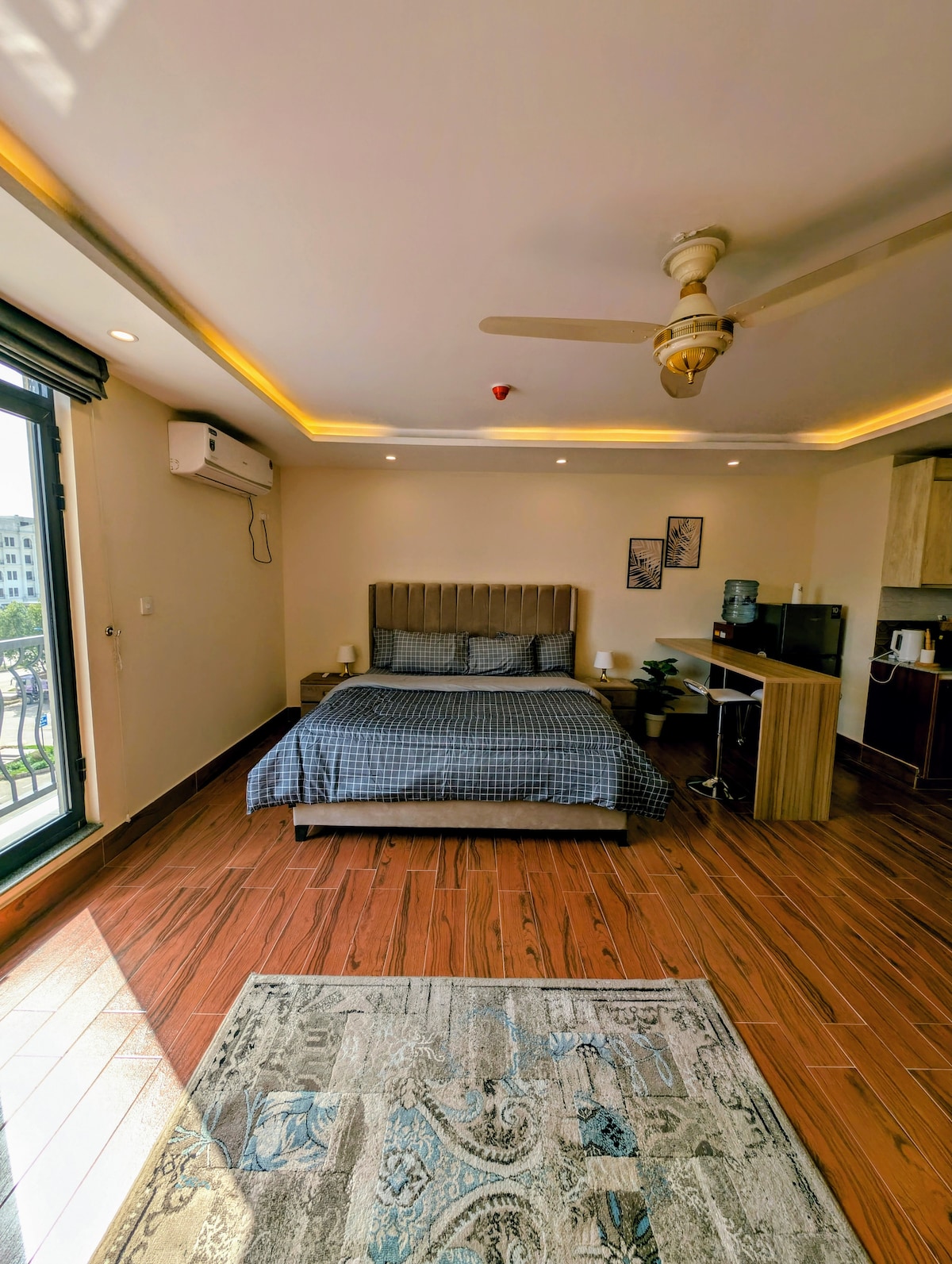 ✨ Nowoczesne i przytulne miejsce na pobyt ✨ Ciesz się stylowym wypoczynkiem z łóżkiem typu queen, eleganckim wystrojem i ciepłym oświetleniem. Duże okna oferują piękny widok, a wygodna część wypoczynkowa jest idealna na relaks. ✅ Najważniejsze cechy: Nowoczesne, jasne wnętrze Klimatyzacja Spokojna i prywatna lokalizacja 📍 Blisko kawiarni, sklepów i atrakcji – idealne dla par lub podróżujących w pojedynkę.