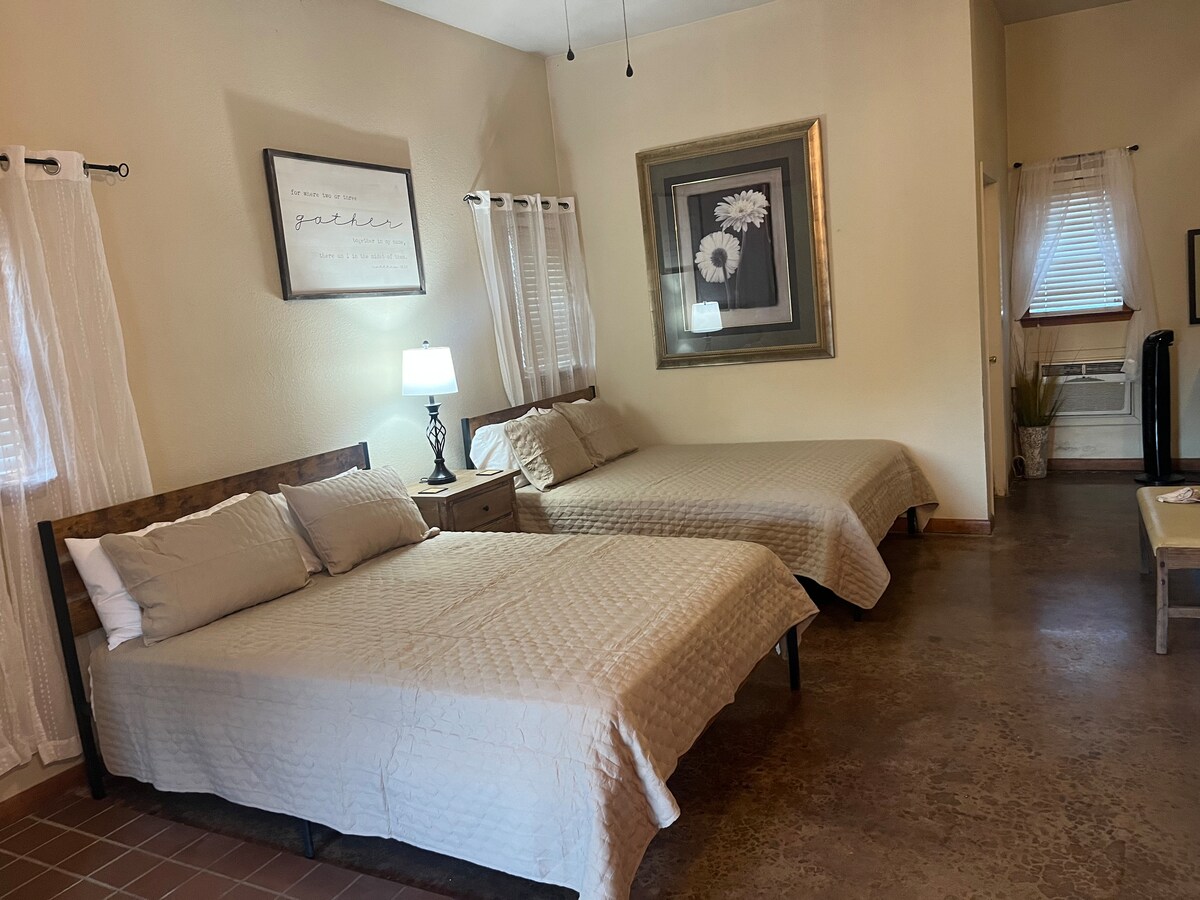 Zrelaksuj się w naszym uroczym apartamencie hotelowym. Z barem kawowym i dużym łóżkiem, które wygląda jak chmury, z pewnością zrelaksujesz się w tym malowniczym apartamencie hotelowym położonym przy zabytkowej głównej ulicy w centrum Quanah w stanie Teksas. Poznaj historię tego pięknie odrestaurowanego budynku pełnego detali architektonicznych. Idealne dla par lub małej rodziny (kanapa dla 2 osób). Spaceruj po ceglanych ulicach, aby zrobić zakupy lub zjeść kolację w pobliżu. Zarezerwuj pobyt u nas już dziś! (Na piętrze Unit-Not dla wózków inwalidzkich.)