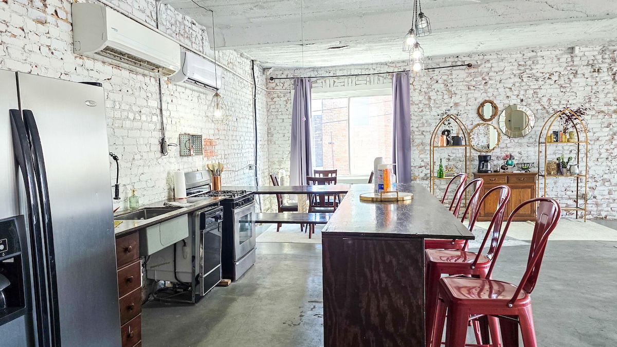 Ten loft na wyższym piętrze znajduje się w naszym pięknie odrestaurowanym budynku z 1916 roku. W apartamencie znajduje się łóżko typu queen, w pełni wyposażona kuchnia, stół kuchenny dla dwóch osób oraz efektowna wyłożona kafelkami łazienka z prysznicem. To luksusowe miejsce na pobyt w stylu art deco, które łączy w sobie lata 20. i 2020. Uwaga: do loftu prowadzą tylko schody. Ze względu na prace budowlane 1st Street jest zamknięta dla pojazdów, ale chodnik i pobliski parking publiczny pozostają dostępne.
