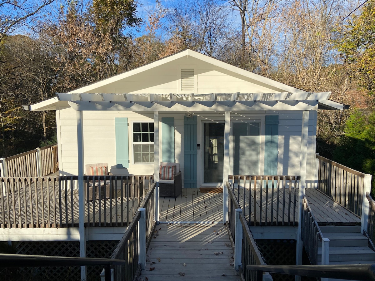 Sawmill Cottage to domek o powierzchni 1500 stóp kwadratowych z główną sypialnią i pełną łazienką na parterze, prowadzącą do przestronnej osłoniętej werandy z pięknym widokiem na las. Dostępny jest dodatkowy apartament, patrz poniżej. Na drugim piętrze znajduje się loft BR z pełną łazienką. Położony na zalesionym terenie z ponad półmilowymi szlakami spacerowymi do pięknego Canton Creek z widokiem na domek na drzewie i wannę z hydromasażem. Tylko 5 minut jazdy do I-575, Northside Hospital i handlu detalicznego. Smart TV i Wi-Fi. Parking bezpośrednio przed domem.