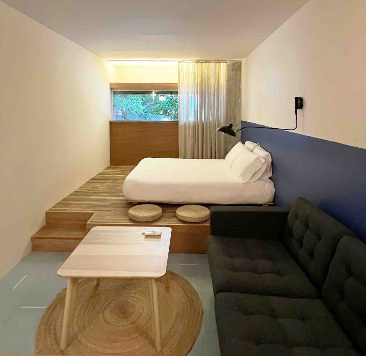 Pokój dwuosobowy typu hotelowego do wypoczynku lub biznesu. Otwórz zasłony, aby poranne światło słoneczne wypełniło tę nowoczesną przestrzeń i przygotować sobie kawę lub herbatę na początek dnia. Wygodne łóżko typu Queen i relaks na sofie przy telewizji Smart TV z bezpłatnym szybkim Wi-Fi / prywatna łazienka z organicznym mydłem/szamponem i klimatyzacją. Współdzielony aneks kuchenny i pralnia Aby wejść na teren obiektu, należy przesłać: – Liczba gości – Muszą podpisać naszą umowę wewnętrzną (regulamin domu)