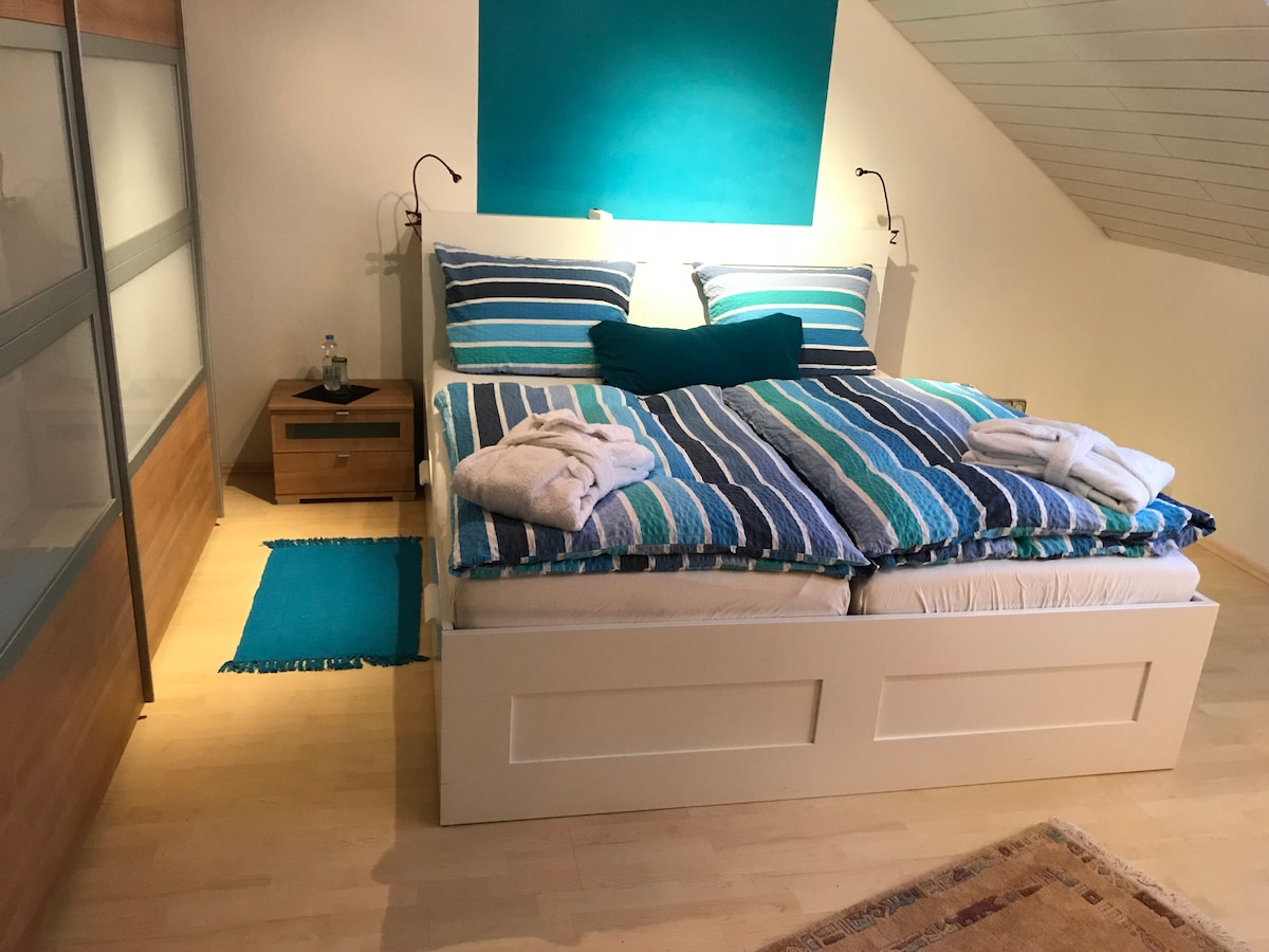 Przestronne mieszkanie na pierwszym piętrze (ok. 130 metrów kwadratowych) w idlicznej lokalizacji. Oddzielne wejście z zadaszonymi miejscami do siedzenia, mały taras słoneczny i przytulna kuchnia. Apartament posiada Wi-Fi, telewizję satelitarną, centralne ogrzewanie, pralkę i bezpłatny parking. Dostępne są również magazyny na rowery i motocykle (konieczne wcześniejsze ustalenia). McDonalds, piekarnia i supermarkety (REWE, V-Markt) oddalone są o zaledwie 500 m i można do nich łatwo dotrzeć pieszo.