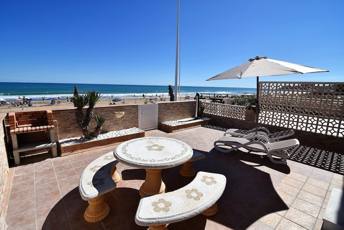 Duży dwupoziomowy penthouse tuż przy plaży Bardzo przestronny i jasny dwupoziomowy penthouse, idealny do korzystania z dobrej pogody dzięki 3 dużym tarasom (z markizą). Główny taras łączy się z oddzielną kuchnią i przestronnym salonem-jadalnią. Nieruchomość posiada klimatyzację i wentylatory sufitowe w 3 sypialniach oraz 2 kompletne łazienki (1 na parterze i 1 na pierwszym piętrze). Główna sypialnia na pierwszym piętrze ma własną łazienkę z wanną i oddzielny taras.