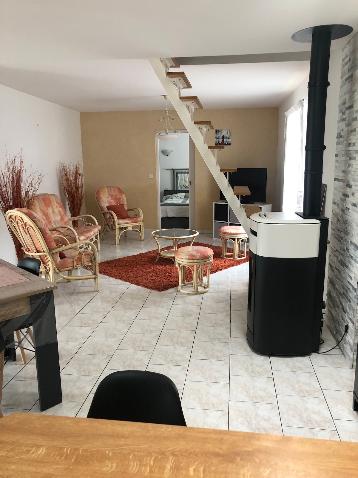 Pragnienie spokojnego wypoczynku na wsi. Czekamy na Ciebie w naszej oazie spokoju na wsi. Znajduje się 1,7 km od miejscowości i około 14 km od La Flèche, 36 km od Le Mans. Nasze mieszkanie może pomieścić 5 osób. -1 duża sypialnia około 25 m² z łóżkiem 140 i 90 cm (możliwość postawienia łóżeczka dziecięcego), w salonie rozkładana sofa dla 2 osób. Wyposażona kuchnia z kuchenką mikrofalową, ekspresem do kawy, płytą indukcyjną, lodówką. - łazienka z prysznicem, toaleta.