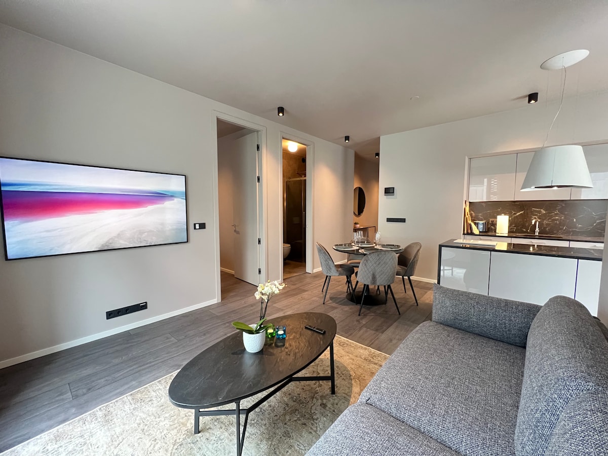 Miejsce jest położone centralnie, dzięki czemu cała grupa może łatwo się poruszać. Apartament o powierzchni 468 stóp kwadratowych, który jest dobrze położony i nowoczesny, przestronny. W pobliżu sklepów, restauracji i kawiarni. 65-calowy telewizor Qled Samsung. Bezpłatna sieć bezprzewodowa. Łóżko i sofa Serta odpowiednie dla 2 osób dorosłych. Kuchnia wyposażona jest w kuchenkę, piekarnik, kuchenkę mikrofalową, toster, szybkowar, ekspres do kawy Nespresso i wszystkie przybory. Nowy apartament w spokojnej lokalizacji w centrum miasta. Przystanek Flybus.
