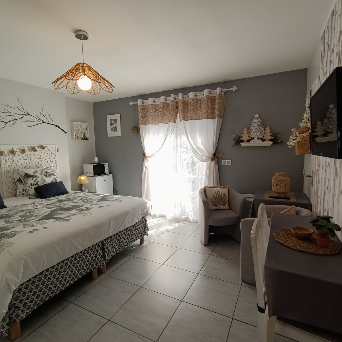 Cette vaste chambre de 28 m², avec accès indépendant par la cour, possède une belle hauteur sous plafond. Ses poutres apparentes et son beau mur en pierres apportent charme et authenticité. Profitez d'une grande salle d'eau de 5 m² avec douche à l'italienne, lavabo et WC (serviettes fournies). Dans la chambre, vous profitez d'un lit en 160 qualité hôtelière 4*, avec du linge de lit haut de gamme fourni. Une télévision en 125 cm est à votre disposition, ainsi qu'une petite enceinte Bluetooth.