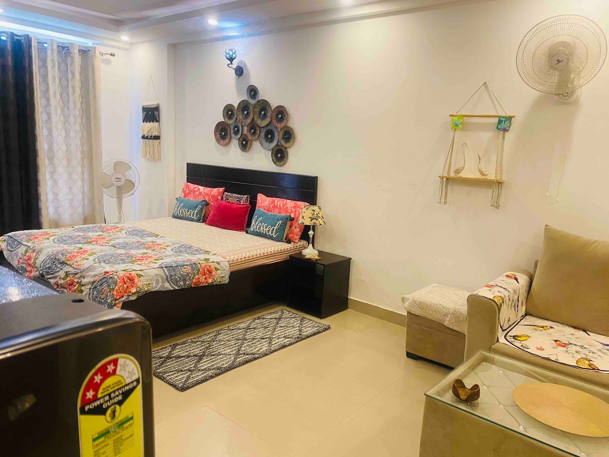 Good Monthly stay discounts available. Kick back and relax in our elegant & fully furnished studio. The earthy interiors will calm you like a boutique hotel experience. A combined charm of English design elements and luxury that offers comfort and style in every corner. We've designed this space with the same care and attention to detail as we were to live here ourselves, prioritizing comfort, style, and authenticity. Top floor | Fast WIFI | Private Balcony | Heart of Noida