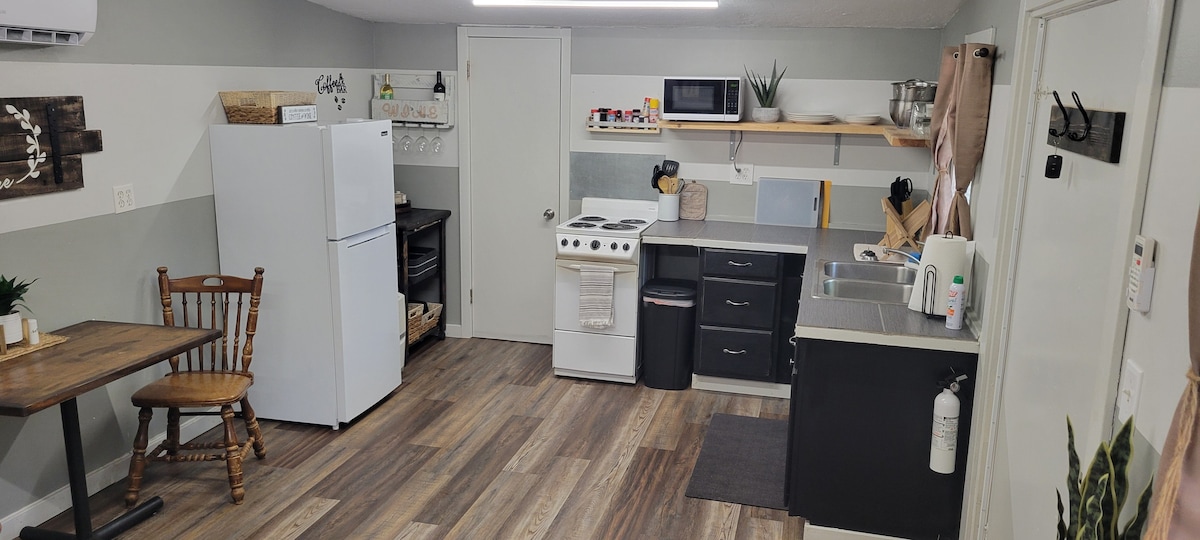 Skromny, przytulny domek gościnny. Przestrzeń ma 300 stóp kwadratowych i posiada wszystkie niezbędne elementy, dzięki którym poczujesz się jak w domu. Domek dzieli tę samą nieruchomość z głównym domem. Posiada pełnowymiarowe łóżko z materacem z pianki termoplastycznej. Pełna kuchnia dla tych, którzy wolą gotować własne posiłki. Zapas kawiarki i wina. A kilka kroków od drzwi wejściowych znajduje się miejsce do siedzenia przy ognisku. Jest też łazienka z dużym prysznicem wyłożonym ceramicznymi płytkami i ławką.