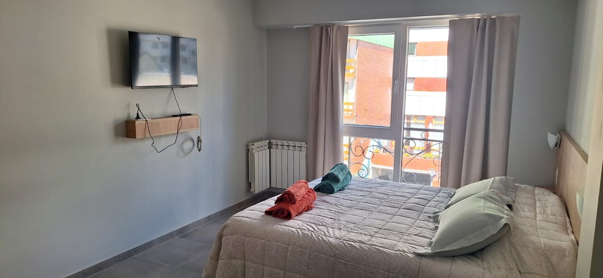 Ubicado en la calle principal de Bariloche, a 200 mts del lago Nahuel Huapi y de la Catedral. A 600mts del Centro Cívico. Disfrutá de la zona: bares, supermercados, chocolaterías y tiendas. Transporte público cercano. Supermercado abajo. Cama doble o 2 camas individuales, TV, horno eléctrico, microondas, heladera y pava eléctrica. Desayuno seco. Baño completo con barral. Edificio accesible con rampa y ascensor. Cuenta con gimnasio en el edificio y parking en las inmediaciones, ambos de pago.