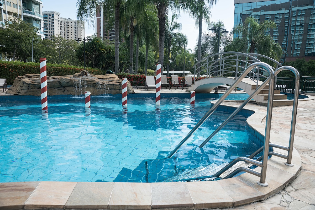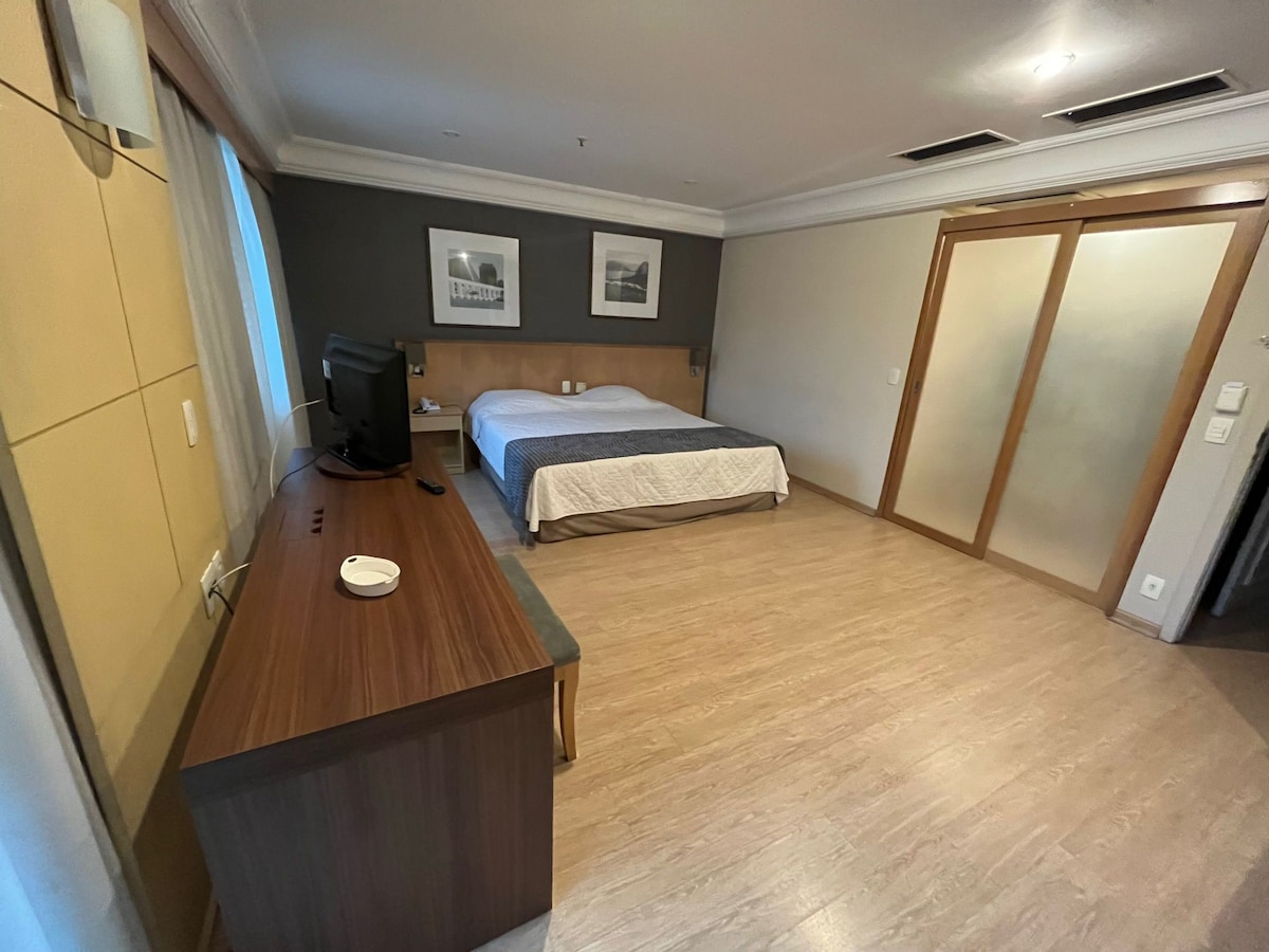 Super ciche i przytulne otoczenie w najlepszej lokalizacji Barra da Tijuca ✨ Dostęp do promu do Praia da Reserva i całego obszaru rekreacyjnego hotelu: basenu, sauny i w pełni wyposażonej siłowni (w środy basen jest zamknięty z powodu prac konserwacyjnych) TUTAJ NIE PŁACISZ OPŁATY ZA SPRZĄTANIE 😉 W pokoju znajduje się klimatyzacja dzielona, SMARTV 32', prywatna łazienka, balkon i mini minibar. The reception is 24h, the condominium is super secure and parking is included in the reservation👍🏻 SOMOS PETFRIENDLY 🐶