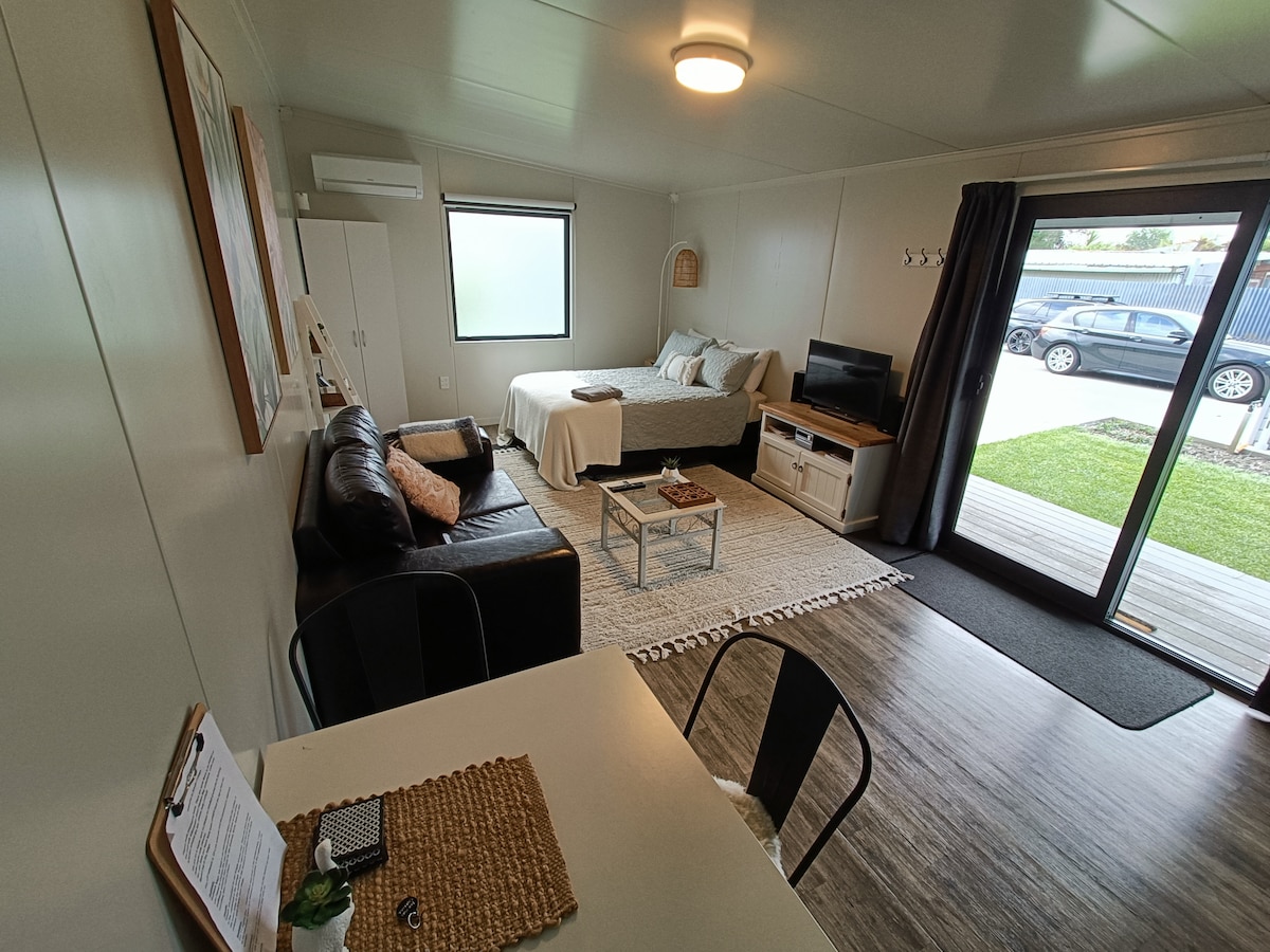 Witaj w naszej przytulnej chatce. Nowo wybudowane z wysokim wykończeniem będziesz cieszyć się pobytem w świeżej, jasnej przestrzeni. Wyposażone w pompę ciepła/klimatyzację, aneks kuchenny, lodówkę, kuchenkę mikrofalową, telewizor Smart TV z Netflix, stół i krzesła, duży prysznic, toaletę, umywalkę, łóżko typu queen z pościelą, kołdrę, koc elektryczny i ręczniki. Znajduje się w Pirimai Napier, tuż przy drodze Kennedy 'ego. Zaledwie 7 minut jazdy do Napier i 15 minut do Hasting & Airport. Parking tylko na ulicy.