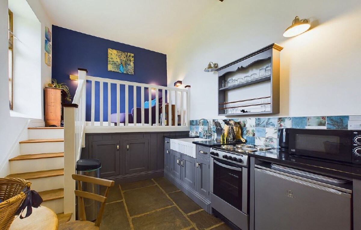 Cottage style annexe, 4 comfortable rooms, Own entrance Kitchenette, Belfast sink Kettle toaster combination microwave (oven/grill/microwave) Single Ring Hob Slowcooker larder fridge pots cutlery Complimentary Breakfast Cereals Tea Coffee Sugar. Fresh eggs from our hens Downstairs shower room/toilet washbasin towels Snug lounge /log burner, please bring your own logs/kindle. DVD player/movies Upstairs bedroom/double bed WiFi An ETA for guests Check-In is needed the day before arrival
