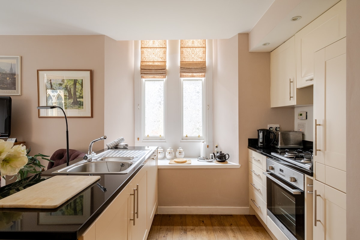 Apartament Boys Dormitory to przestronny, czterogwiazdkowy apartament z jedną sypialnią, położony na sklepionym ostatnim piętrze wiktoriańskiego klasztoru. Ogromne łukowate okna z kamiennymi ramami wychodzą w trzech kierunkach, a każde z nich oferuje rewelacyjne widoki na krajobraz. Klasztor jest bez wątpienia najpiękniejszym budynkiem opactwa i znajduje się w najbardziej widocznym miejscu, z którego roztacza się widok na Loch Ness, krużganki i ogrody.
